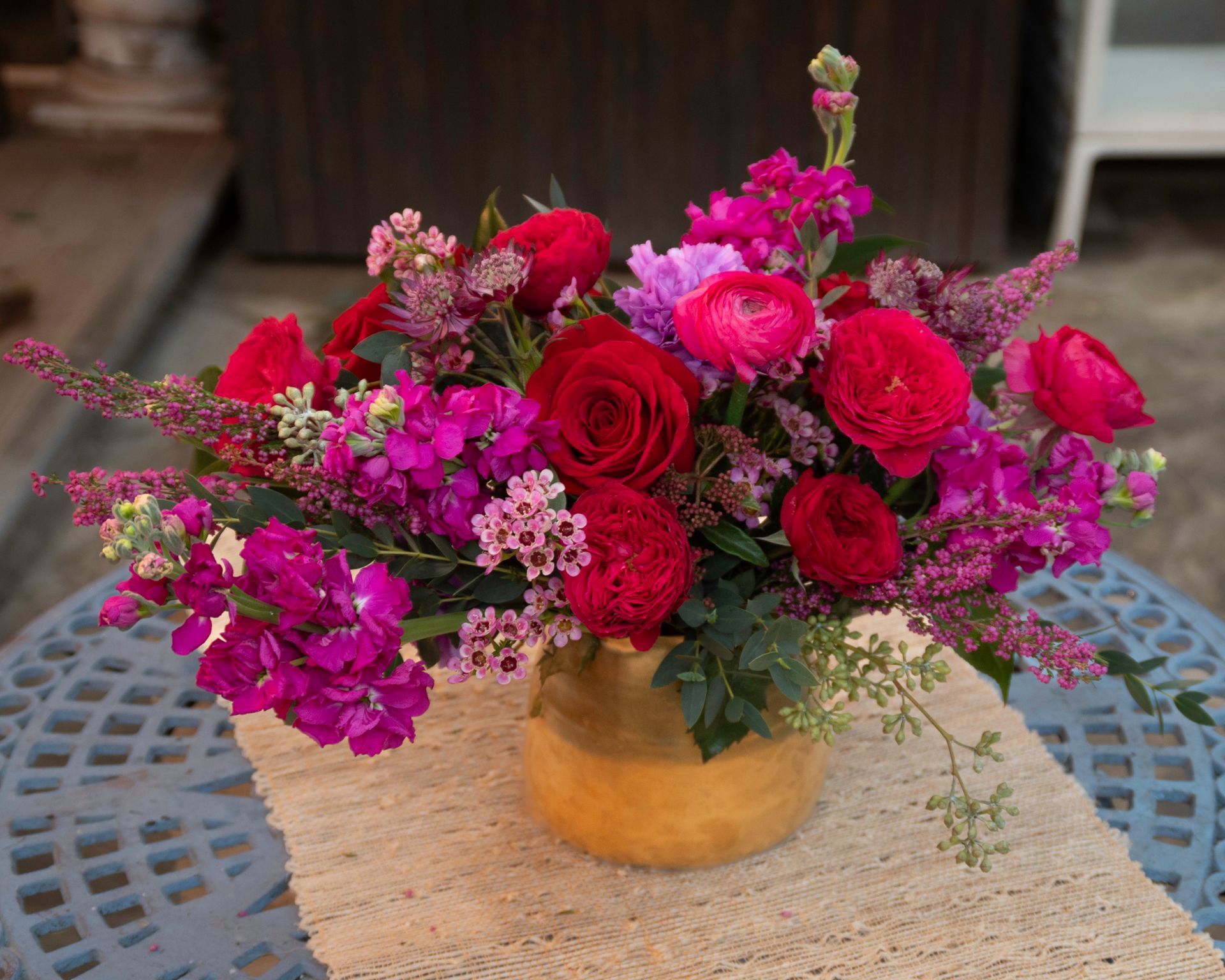 Wow that special someone with this bold and beautiful arrangement of reds, hot pinks, and purples served up in a gold vase (while supplies last).
