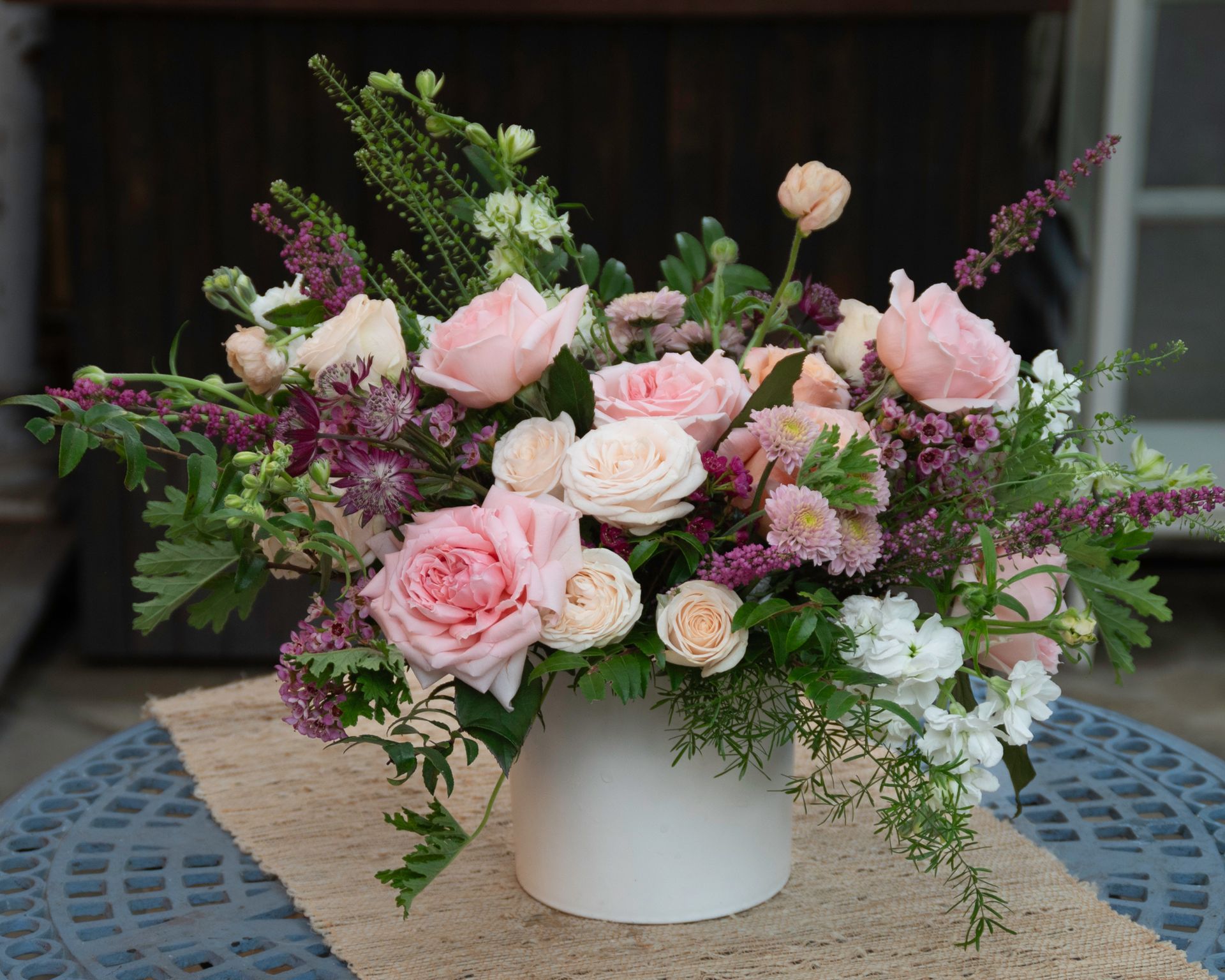 Delight the senses with this sweet smelling pastel collection of roses, sweet peas, locally grown heather and more! Flower types may vary.