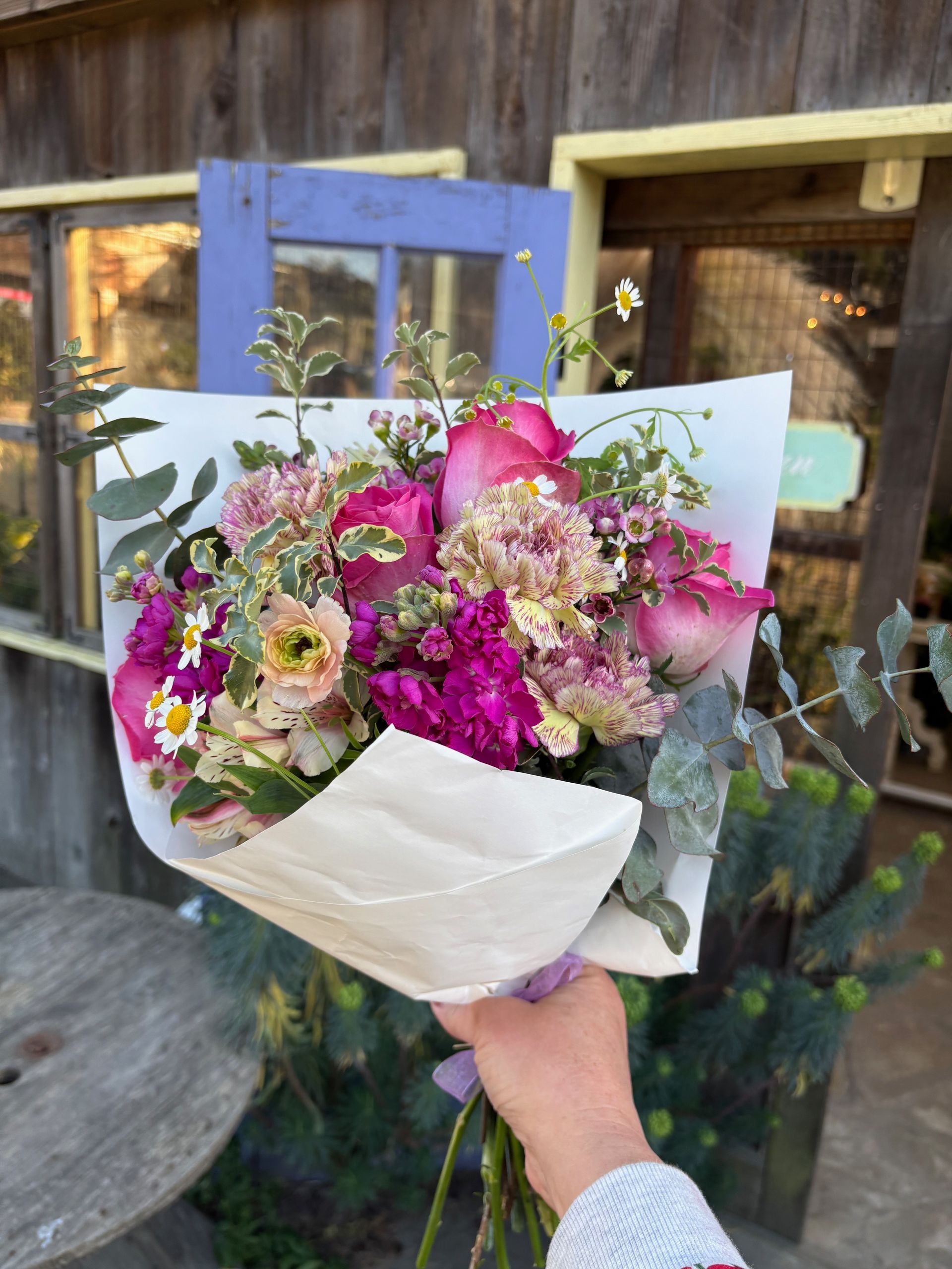 Treat the gals in your life to the gift of sweet smelling roses and sweet peas AND a sachet of lavender and lavender hand cream from our very own Half Moon Bay Lavender. One size $95 (purple lavender pot not included).